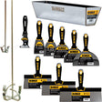 Los juegos de herramientas manuales DEWALT Drywall Tools ofrecen a los acabadores una variedad de opciones para herramientas manuales de alto rendimiento. Nuestras cuchillas de acero inoxidable de primera calidad proporcionan índices de aplicación más rápidos, un control óptimo de la cuchilla y un acabado más suave. Elige el conjunto que mejor se adapte a tus necesidades. Las espátulas para encintar y para masilla de acero inoxidable DEWALT están diseñadas y fabricadas utilizando casi 20 años de aportes de acabadores profesionales. Nuestras cuchillas para encintar cuentan con hojas de acero inoxidable de alta calidad para resistir la corrosión, así como placas traseras anodizadas rígidas que son más anchas y gruesas que los modelos de la competencia. Nuestras navajas conjuntas cuentan con un pulido hueco de precisión que proporciona un punto de flexión adecuado en la mitad de las hojas (en lugar de cerca de los mangos) para que las hojas se sientan bien "rotadas" desde el primer momento en que las usa. Los cómodos mangos antideslizantes de agarre suave minimizan la fatiga y están reforzados con núcleos de nailon reforzado con fibra de vidrio. Los cuchillos también tienen extremos de martillo de metal para reajustar clavos para paneles de yeso. Este juego de herramientas manuales incluye mezcladores profesionales de 32" y 13", una navaja de pintor 9 en 1 de acero al carbono, así como una bandeja para barro contorneada de acero inoxidable de 14". Diseñados y fabricados para profesionales de la industria, nuestros juegos de herramientas manuales están garantizados. Tough® Están respaldados por una de las garantías más sólidas de la industria, así como por la red de servicio nacional de DEWALT .