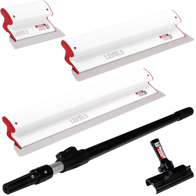 Los juegos de cuchillas para desnatado de materiales compuestos para paneles de yeso LEVEL5 agregan esa ventaja adicional a su arsenal de herramientas de acabado. Este es un conjunto de herramientas todo en uno para desnatar paneles de yeso, ideal para alisar y dar acabado a compuestos frescos en paredes y techos.