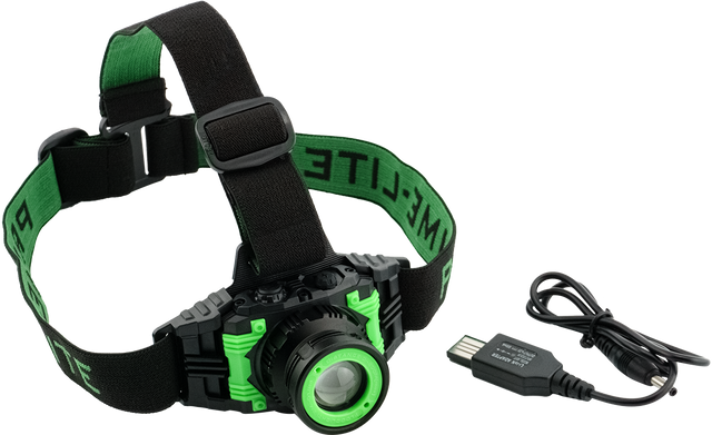 Linterna frontal recargable con función de zoom para enfocar espacios más reducidos a una distancia de hasta 200 metros.