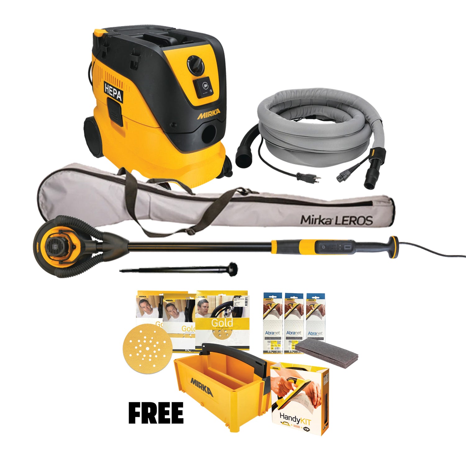 Ponceuse à cloisons sèches Mirka Premium LEROS 9" avec système d'aspiration des poussières à filtre automatique et kit de fournitures pour cloisons sèches GRATUIT