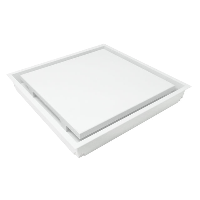 Price-conscious, minimalist framed exhaust fan mount and cover. DIY-friendly, drop-in install lays on top of the surface and can be retrofitted at any time.